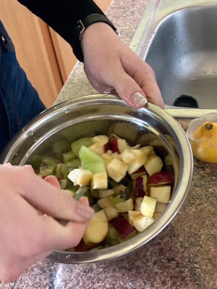 Pondělní kuchyňka patřila tentokráte našim deváťačkám, které si ve skupinkách připravily libovolný recept, přichystaly si a donesly suroviny a daly se do práce. Palačinky i ovocný salát se moc povedl. Tématem hodiny PČ v devátém ročníku však jsou digitální technologie, a proto bylo prioritou zachytit průběh vaření a nasnímat zhotovené jídlo na fotoaparát. Dobrá věc se