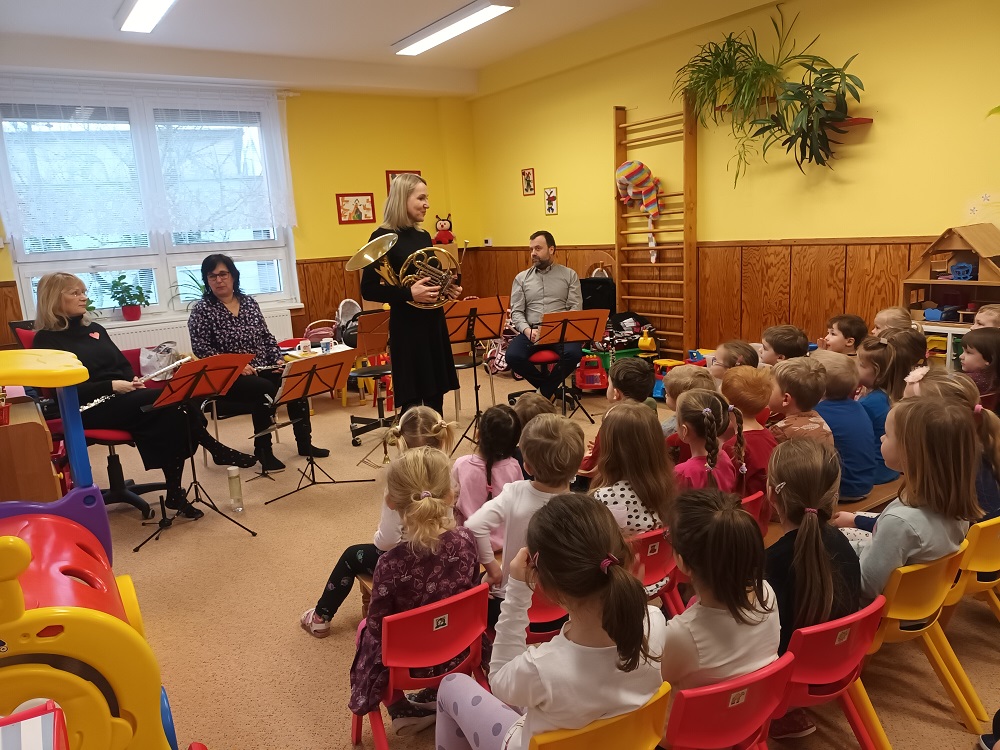 Dne 12. 2. 2024 do naší MŠ přijelo Pohádkové dechové kvinteto z Filharmonie Hradec Králové s hudební pohádkou „Jak šli muzikanti do světa“. Pohádkové povídání bylo proloženo hudebním doprovodem složeným z příčné flétny, hoboje, klarinetu, lesního rohu a fagotu. Děti si na závěr vyzkoušely roli dirigenta.