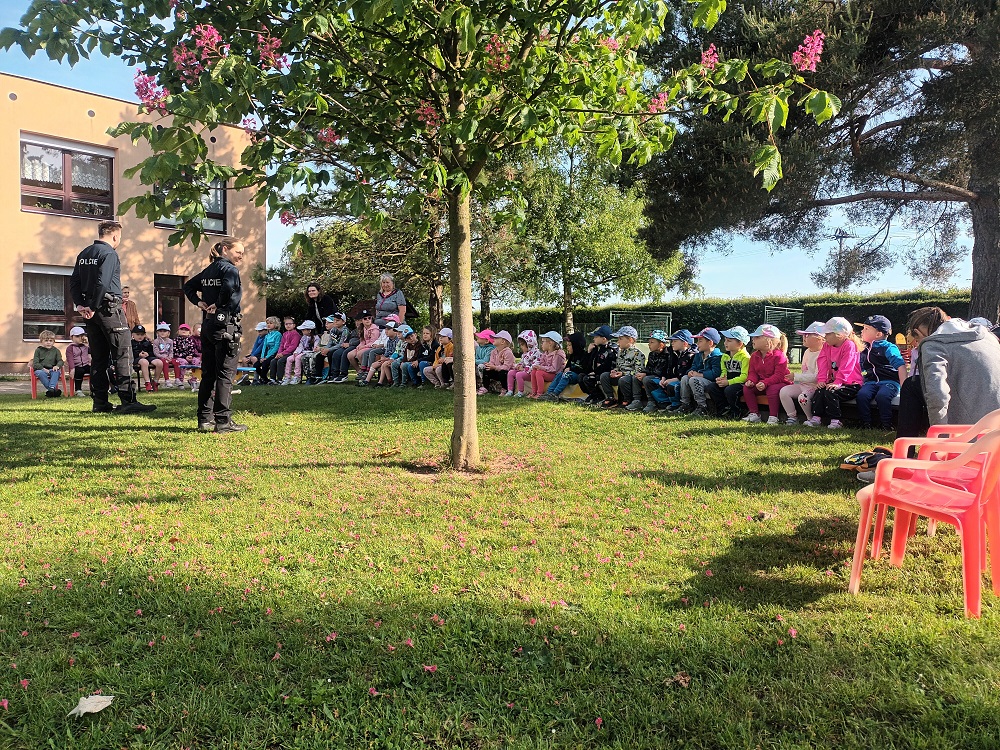 Dne 21. 5. 2024 nás navštívila Policie ČR ze Smiřic. Děti si zopakovaly zásady bezpečné jízdy na kole i jeho povinnou výbavu. Prohlédly si předměty, které policista potřebuje k vykonávání svého povolání – zbraň, vysílačku, obušek, pouta, vestu, světlomet atd. Leccos si mohly dokonce samy vyzkoušet. Přednáška byla ukončena posezením v policejním voze. Děti byly