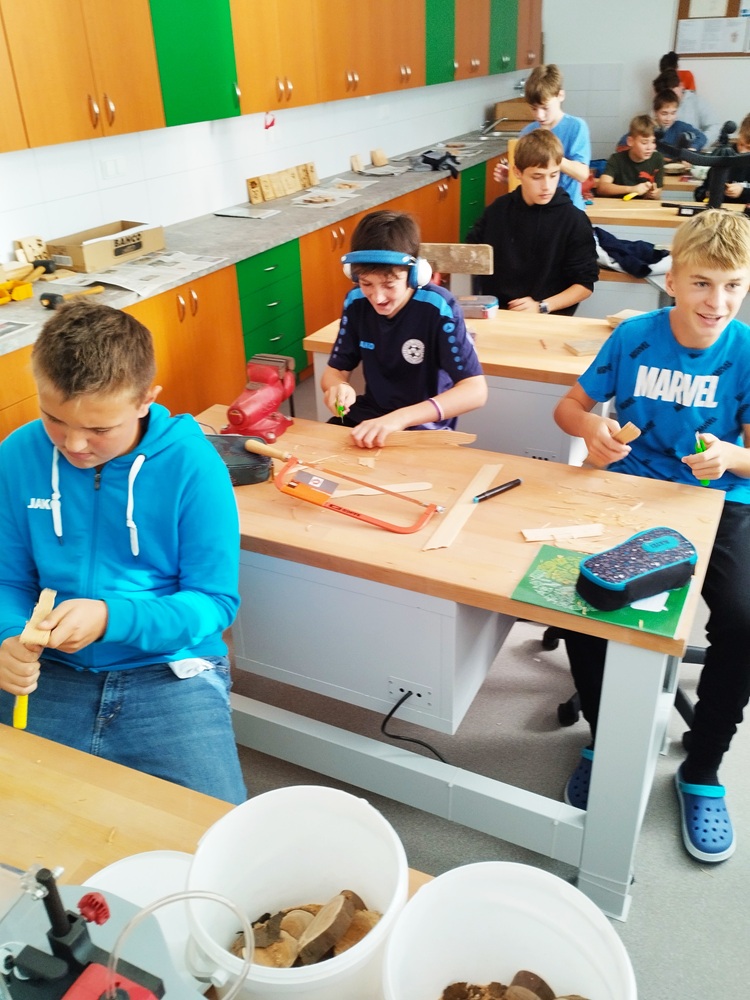 V hodinách pracovní výchovy se chlapci ze sedmých tříd pustili do výroby dřevěných obraceček na palačinky. Pracovali poprvé na nových strojích, které škola nedávno pořídila. I když to pro mnohé byla úplná novinka, rychle si práci s nářadím osvojili. Nejprve si pečlivě nakreslili návrh a vybrali vhodné kusy dřeva. Poté začali řezat, brousit a tvarovat