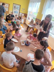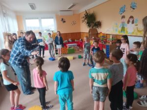 Dne 5. 6. 2025 nás v rámci kooperace navštívil rodilý mluvčí ze ZŠ Adam Kristofer, aby společně se žáky 5.ročníku předvedl anglickou konverzaci. Tématem lekce byla pohádka „Zlatovláska a tři medvědi“. Školáci ji zdramatizovali, společně si s našimi dětmi zazpívali písničku a poté vyrobily škrabošky medvídka či Zlatovlásky.