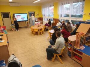 Dne 20. 1. 2026 se v MŠ konala beseda „Zářivý úsměv“. Přišla k nám studentka zubního lékařství, slečna Hendrychová, která společně s kolegyní rodičům přednášela o správné péči o dětský chrup a odpovídala na zajímavé dotazy.