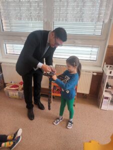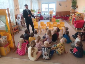 Dne 2. 10. 2025 navštívil naše nejstarší děti pan Jan Holata, aby dětem připomněl některá pravidla slušného chování a zároveň jim řekl pár nových informací ze společenské etikety. Děti se učily, kdo je společensky významnější ve skupině osob, jak se chováme v divadle, jak by mělo probíhat představování. Také si vyzkoušely vázat kravatu.