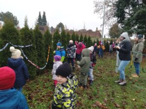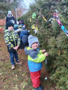 Děti z 1. tříd přinesly vyrobené barevné řetězy, děti z mateřské školy připravily papírové ozdoby a společně zdobily stromy na zahradě MŠ. Toto setkání jsme si všichni velmi užili.