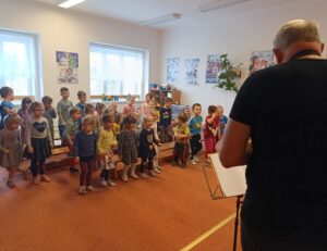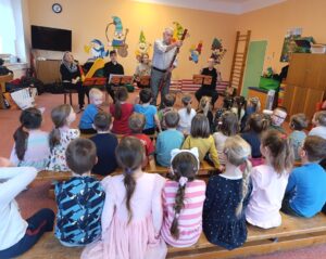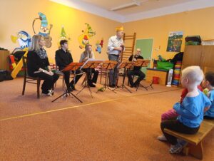 Ve čtvrtek 5.2.2026 nás v MŠ navštívilo  dechové kvinteto Královéhradecké filharmonie  s hudební pohádkou “ Jak šli muzikanti do světa“. Seznámili děti s netradičními hudebními nástroji a  naučili je novou písničku. Děti vytleskávaly rytmus, aktivně se zapojovaly do představení a na závěr si zahrály “ Na dirigenty“.