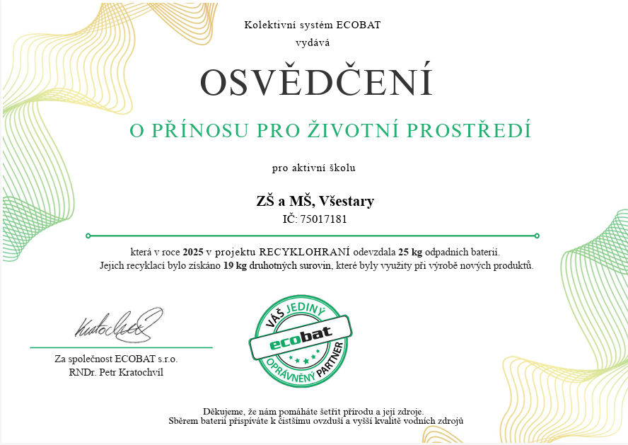 MŠ Chlum obdržela poděkování z programu Recyklohraní za zapojení do sběru odpadních baterií v uplynulém roce. Díky společnému úsilí pedagogů, děti a jejich rodičů se v roce 2025 podařilo vysbírat rekordních 2 487 tun odpadních baterií. Oceněna byla především aktivní role školky v environmentální výchově a propojení výuky s praktickými činnostmi, které vedou děti k odpovědnému přístupu k životnímu prostředí.