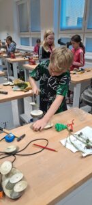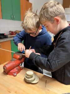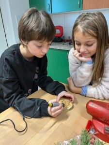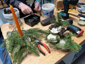 Protože se blíží Vánoce, pustily se děti do výroby dřevěných svícnů. K jejich výrobě použily severský modřín a břízu. Po obdržení materiálu následovalo měření, řezání, šroubování, zatloukání hřebíků a práce s vrtačkou – zkrátka vše, co k truhlářskému řemeslu patří.