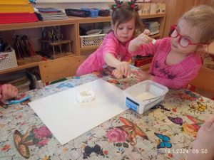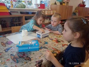 Když napadl sníh,  povídali jsme si o Eskymácích, kde žijí a vyzkoušeli jsme si udělat společné iglú i u nás ve školce. Místo sněhu nám postačily kostky cukru, takže naše iglú jsme mohli i ochutnat.