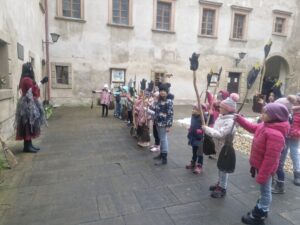 Nejprve jsme společně prošli sklepením, kde děti objevovaly kouzelná zákoutí, pohádkové bytosti i svátečně vyzdobené části hradního podzemí. Poté nás čekala pohádková půda, která všechny okouzlila svými veselými postavičkami a hravým vyprávěním paní průvodkyně.