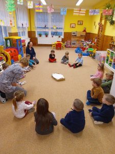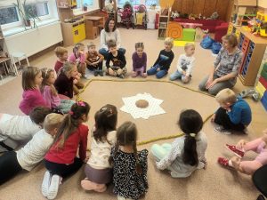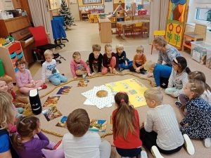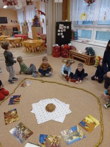 Dne 13. 12. 2023 navštívila naši mateřské škole již tradičně paní Stránská se svým „Vánočním příběhem“ a povídala dětem o podstatě Vánoc. Větší děti vybarvily a nalepily dobroty na slavnostní „stůl“.