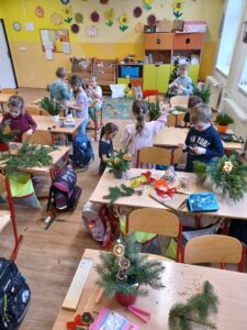 Děti nejprve pečlivě skládaly a upravovaly větvičky, ze kterých postupně vznikal základ svícnu. Poté přišla na řadu ta nejzábavnější část – zdobení. Malí tvůrci použili sušené ovoce a barevné gumové bonbonky, díky nimž byl každý svícen originální a plný barev. Práce šla dětem krásně od ruky a bylo vidět, že je tvoření velmi baví.