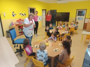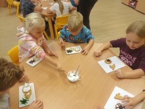 22. 10. 2025 nás navštívila babička Jiřinka, aby s dětmi ozdobila podzimní perníčky. Každý si natřel bílou polevou ducha a kolečko, na které si nalepil pavouka. Již se těšíme, až nás paní Špráchalová navštíví před Vánoci s další várkou perníčků.